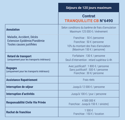 Veuillez noter que si le contrat Tranquillité couvre tous les participants d’un même dossier sans restriction et est accessible à tous nos voyageurs, le contrat Tranquillité CB pour sa part comporte des conditions d’accès :